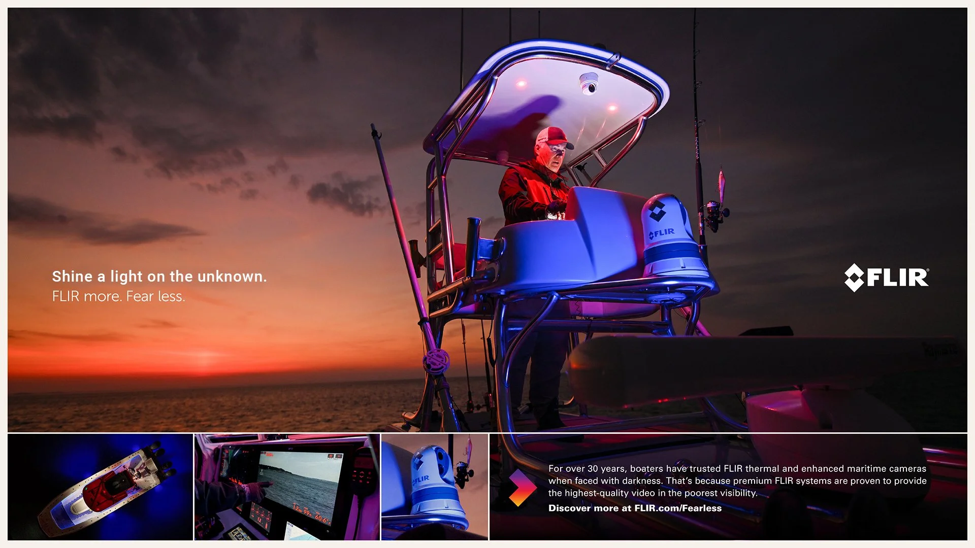 We developed the “Fearless” campaign, speaking to boaters’ caution in low-visibility conditions. Rather than avoiding night boating or adverse weather, FLIR customers can embrace every journey with confidence, knowing they have the dependability that cheaper alternatives lack. The campaign showcased real-world use cases, emphasizing FLIR’s trusted, high-quality performance in safe navigation for mariners, law enforcement, and commercial operators.